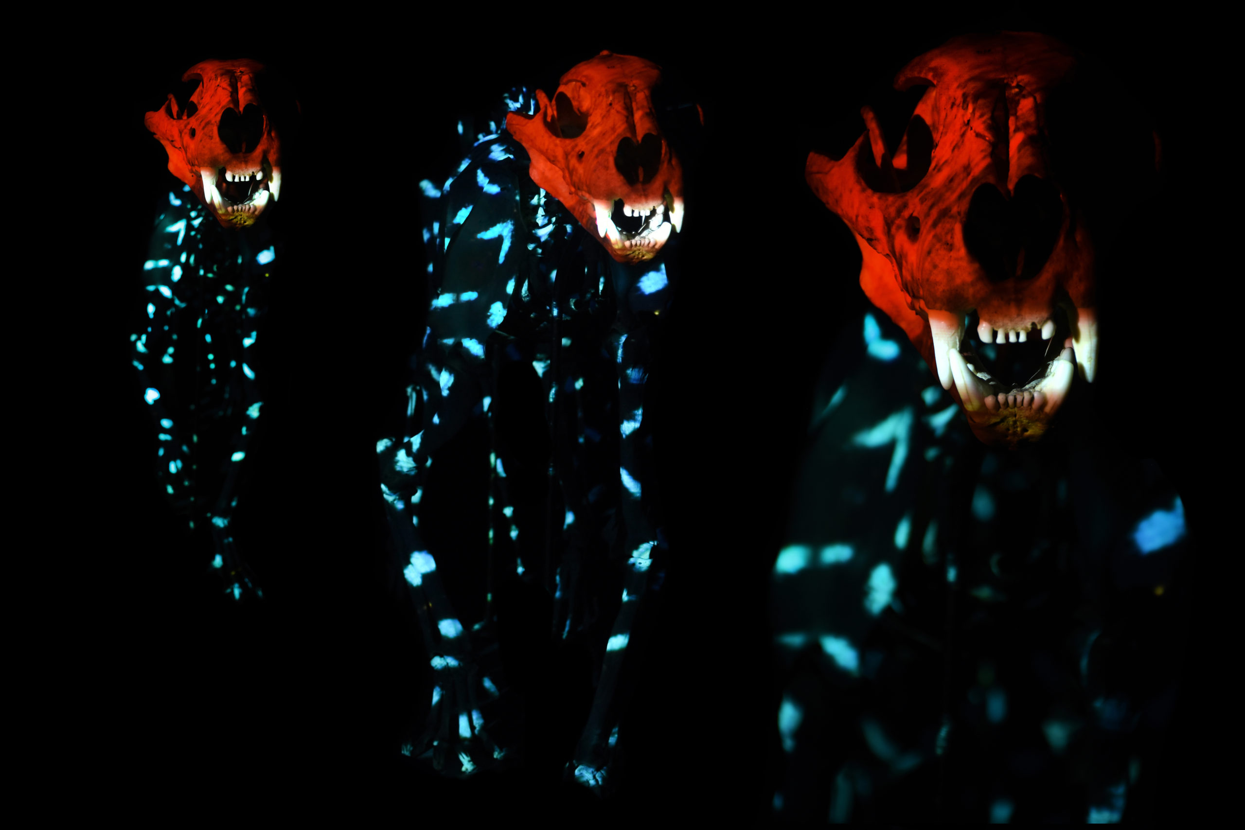 Retratos fotográficos de esqueletos expuestos en la Sala Histórica del Museo de Ciencias Naturales de La Plata con videomapping y proyecciones de texturas provenientes de colecciones científicas.